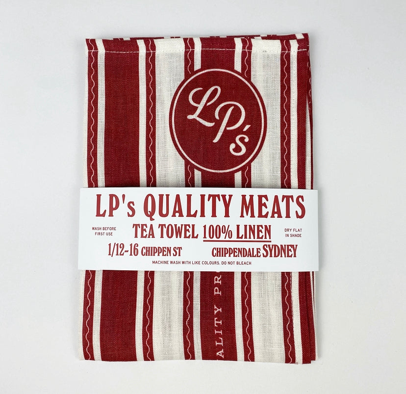Printed Linen tea towel with LP's signature stripe and logo detail. the perfect addition to your kitchen...